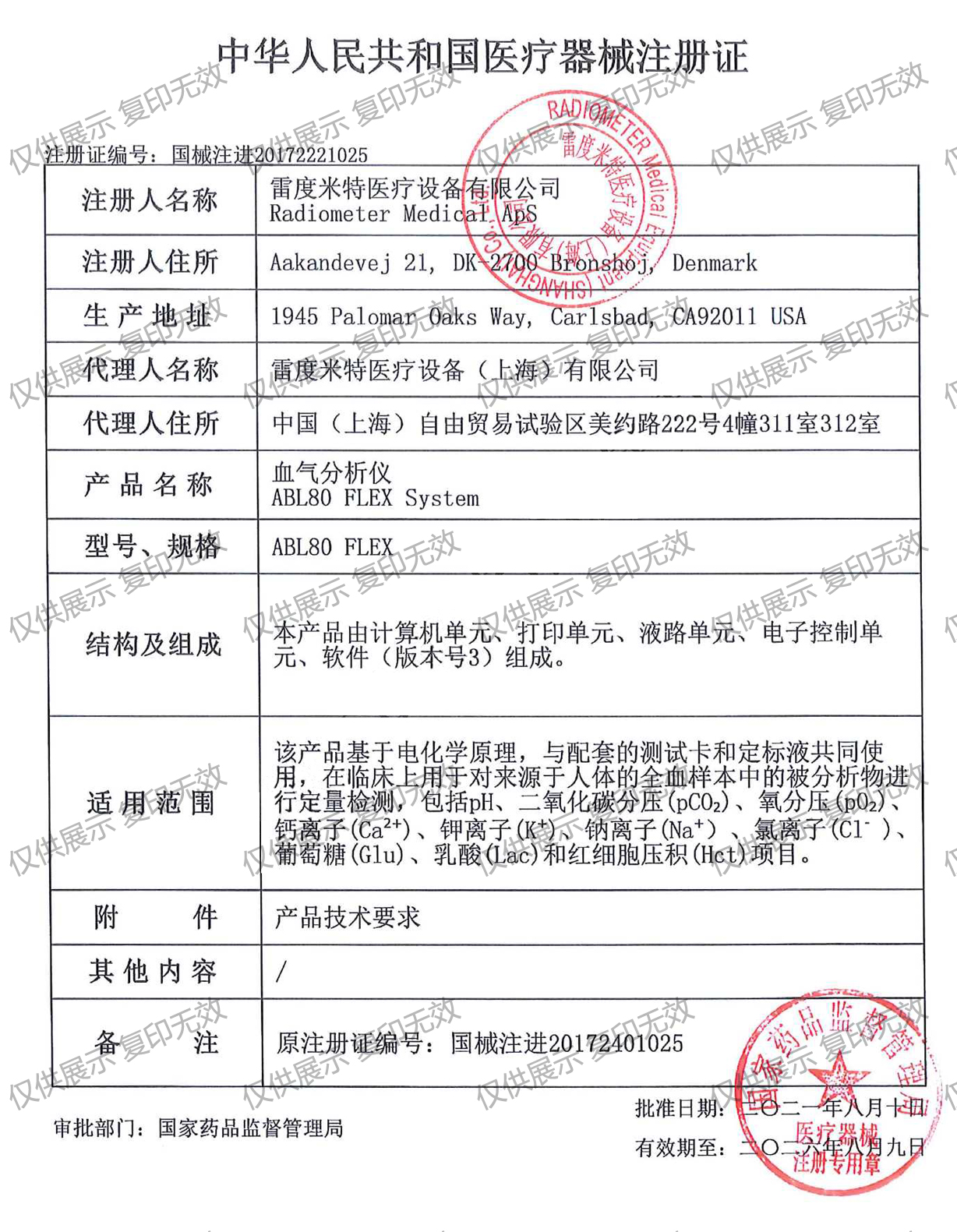 適用范圍:該產(chǎn)品基于電化學(xué)原理,與配套的測試卡和定標(biāo)液共同使用,在臨床上用于對來源于人體的全血樣本中的被分析物進(jìn)行定量檢測,包括pH、二氧化碳分壓(pCO2)、氧分壓(pO2)、鈣離子(Ca2+)、鉀離子(K+)、鈉離子(Na+)、氯離子(Cl- )、葡萄糖(Glu)、乳酸(Lac)和紅細(xì)胞壓積(Hct)項目。