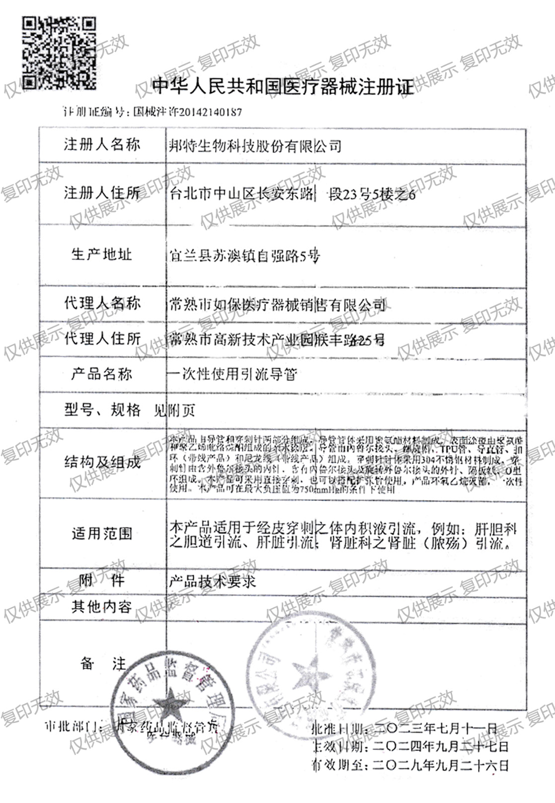 適用范圍:本產品適用于經皮穿刺之體內積液引流,例如:肝膽科之膽道引流、肝臟引流;腎臟科之腎臟(膿殤)引流。